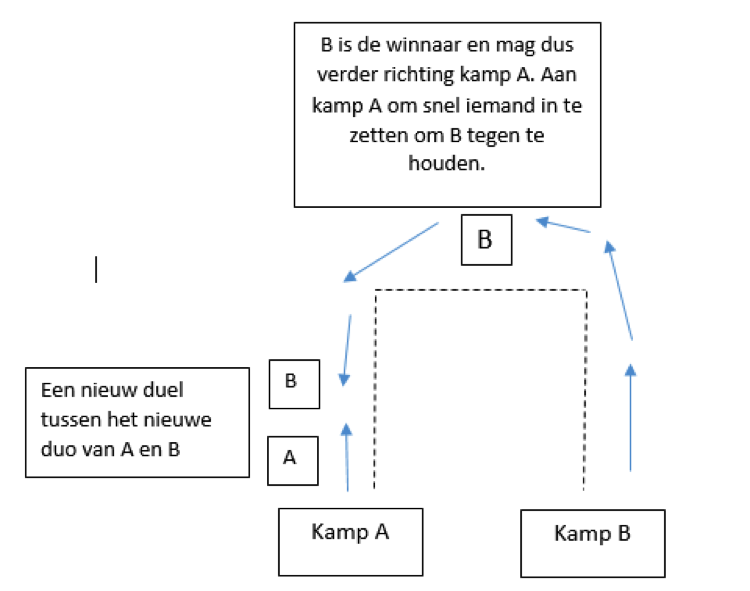 Bij het startsignaal loopt 1 persoon uit kamp A en 1 persoon uit kamp B naar elkaar toe volgens het vierkantparcours. Wanneer ze elkaar ontmoeten gaan ze duelleren tegen elkaar. Het duel spelen ze via de touwtrek app (Rope Pulling) of via een ander duospelletje op de smartphone. De winnaar mag verder lopen richting het kamp van de tegenstanders. Zij laten op hun beurt zo snel mogelijk iemand starten uit hun kamp in de hoop de indringer tegen te houden. Wanneer de nieuwe tegenstanders elkaar tegen komen, duelleren ze opnieuw. Dit herhaalt zich tot er iemand in het kamp van de tegenstanders kon binnen dringen.